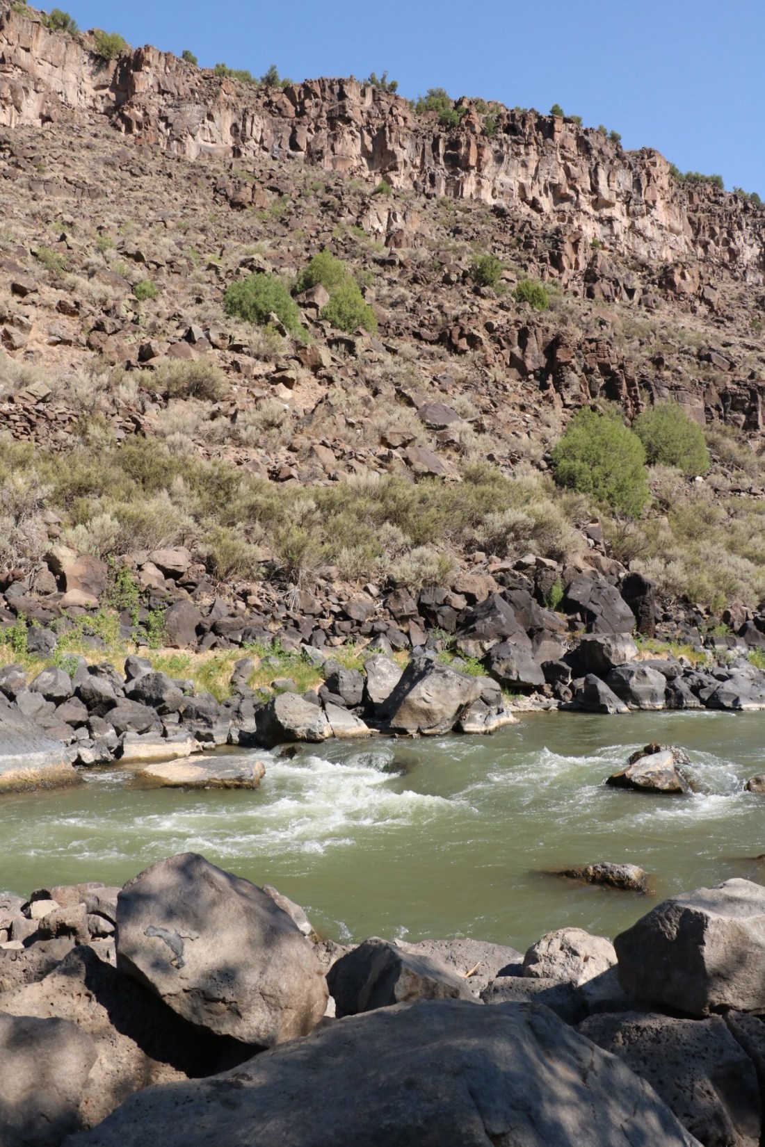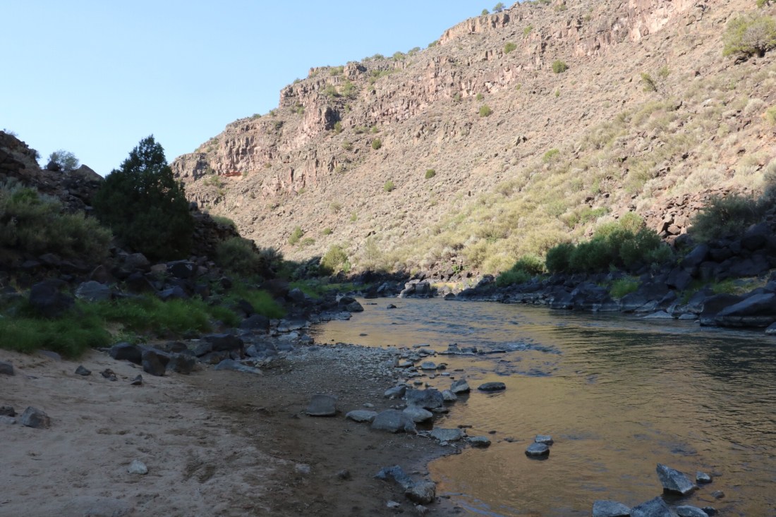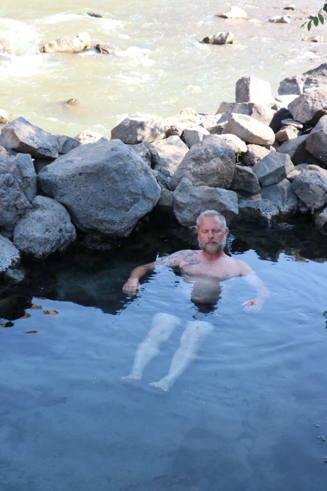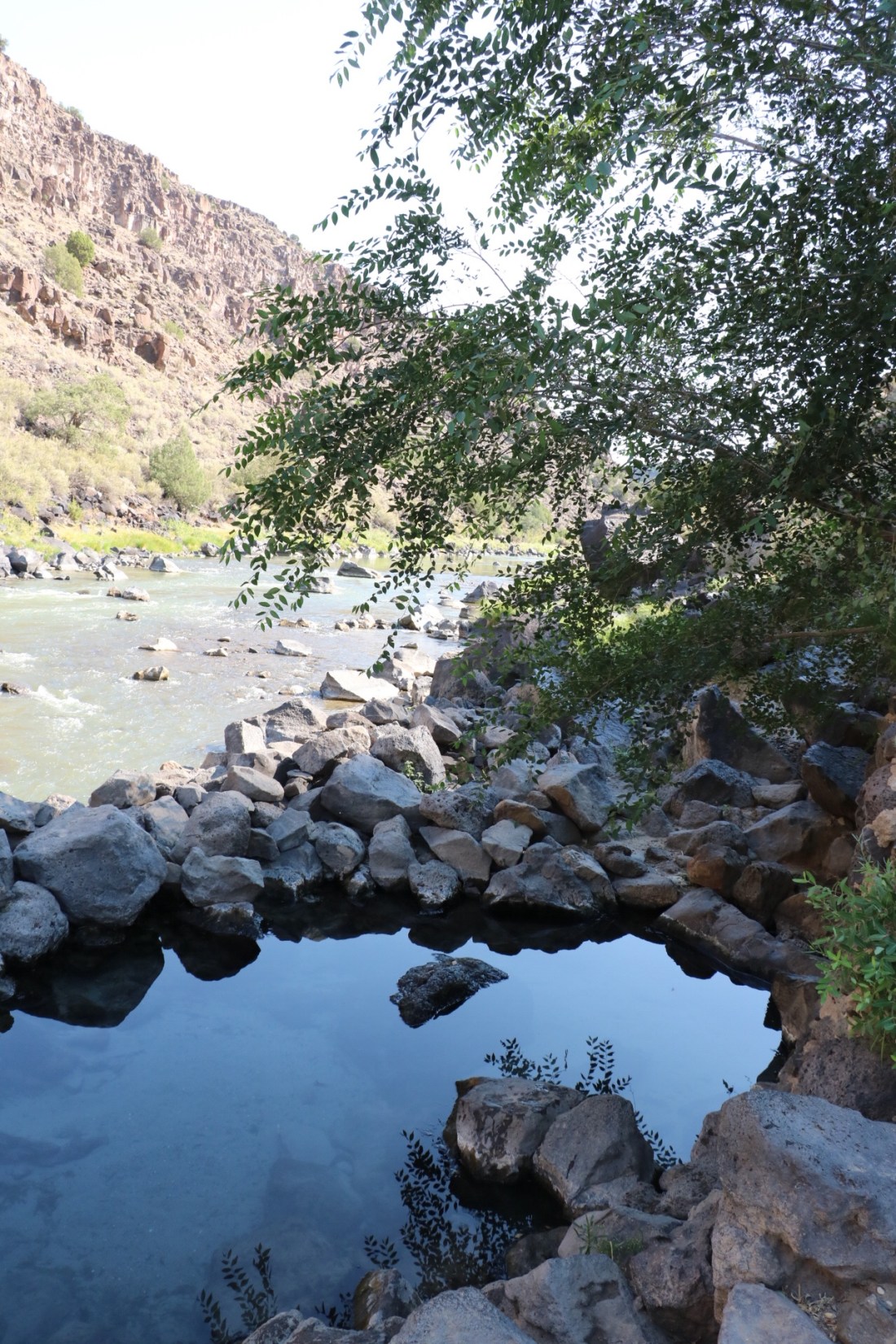 When we arrived at the bottom, both hot springs were occupied, so we decided to let the pups play in the Rio Grande until a group left. This place is clothing optional since it’s a little off the typical path and some groups did choose to do that. Another group had their dog swimming in the spring with them. It was definitely a freeing place. We waited our turn and it was perfect.