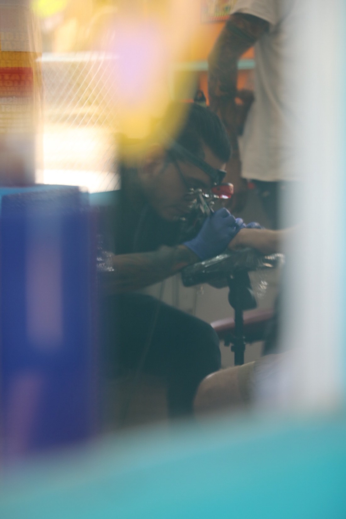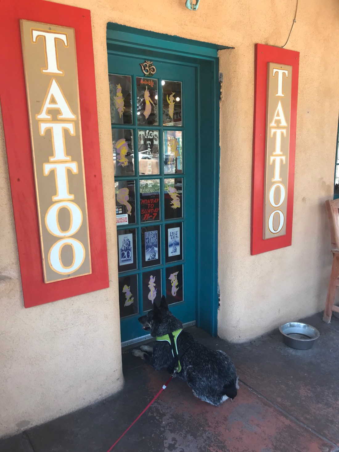 Jason went in and the dogs and I sat on the porch outside. He was getting a quick tattoo so I didn’t feel like I needed to leave to go anywhere. He met with the artist, he drew up the design, and Jason kept coming outside to show me placement and such. Once it was perfect he got started.