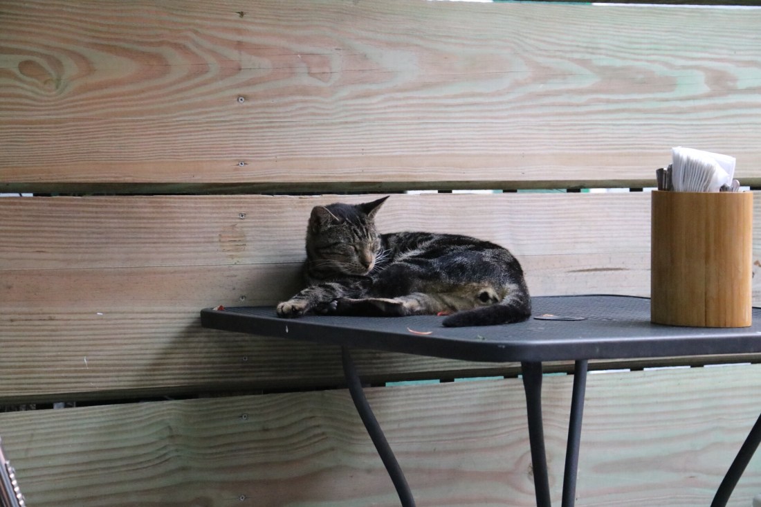 We are getting an early start today because we want to get the full NOLA experience. I found a restaurant named Satsuma right up on Dauphine St where we are staying that has vegan breakfast options and a dog friendly patio. We drive over and settle in to this cute place. There was a cat sitting on one of the tables and apparently that is his table and you are welcome to sit there as long as you pet him. He was adorable!
