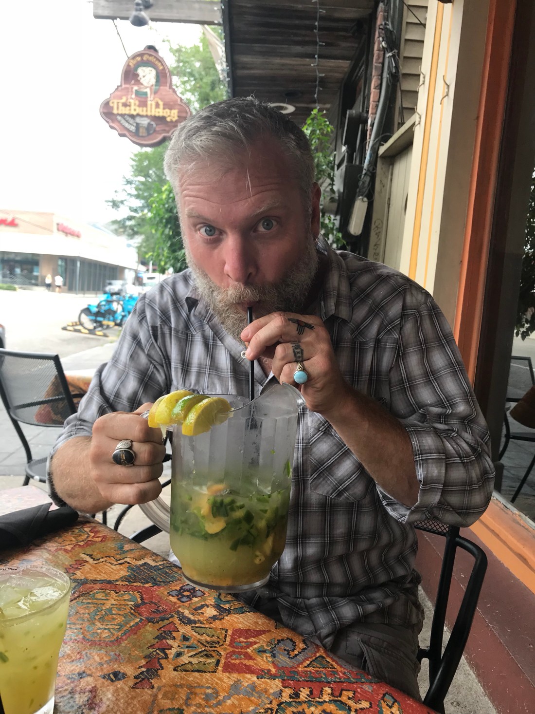 Well lunch time was eventful! We had trouble finding both dog friendly and vegan availabilities. We headed over to Magazine St because it seemed to have the most possibilities. First we walked through what we thought was just a regular old back gate to a bar named Bulldog. They mostly had beer, which hasn’t been my favorite on this trip, and I just wasn’t feeling the food options so I asked Jason if we could go to the Mexican place next door that said it had pitchers of margaritas. Much more my style lately! We walked out the same gate we went in and *ALARMS BLARING!!* yup, it was a security door. It must not have been clicked in all the way when we walked in but we slammed it shut when we got in there so it had to have set it. The dogs got all freaked out so I just dragged them out while Jason went to tell the bartender. Yeah, we were those people. It made no sense.