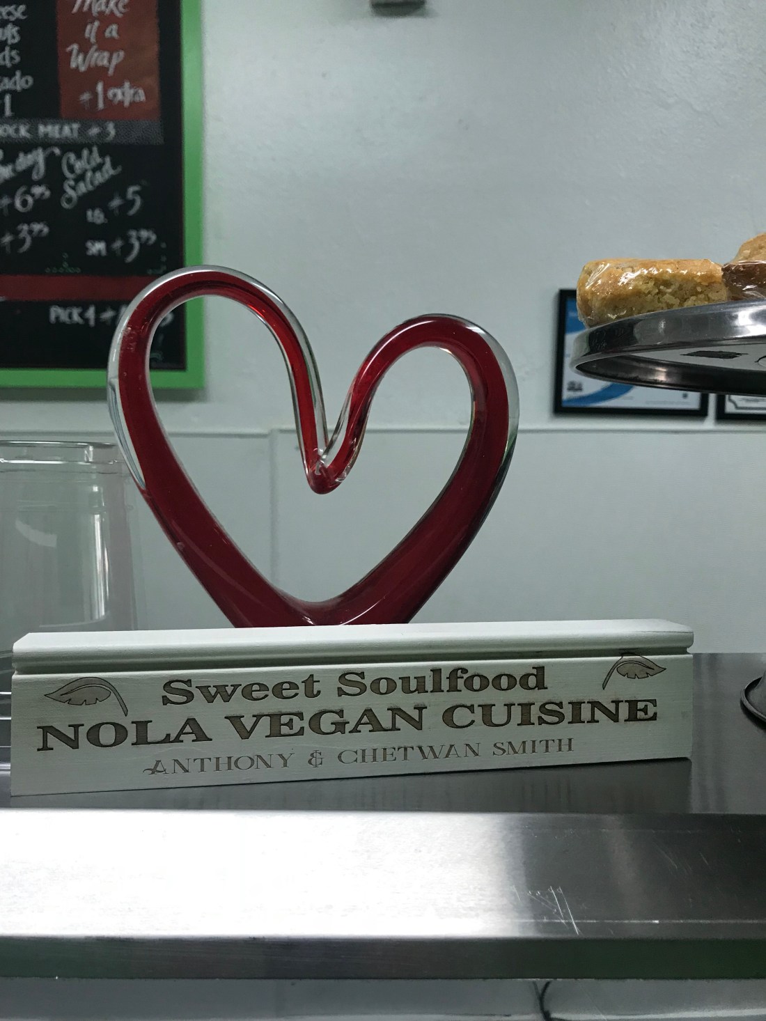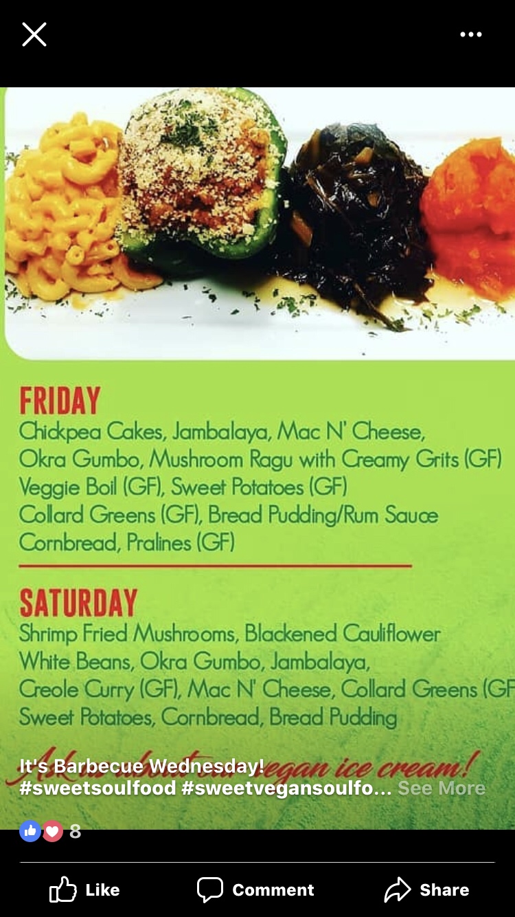Yes, I’m talking about dinner already. I made Jason go get our dinner now because we knew we wanted to walk Bourbon St when it was on full swing as well as go to other places later at night too. I wanted my dinner ready for me at home. I had one place I wanted to go to in NOLA, and that was Sweet Soulfood. All soulfood. All vegan. Here was their menu for Friday.