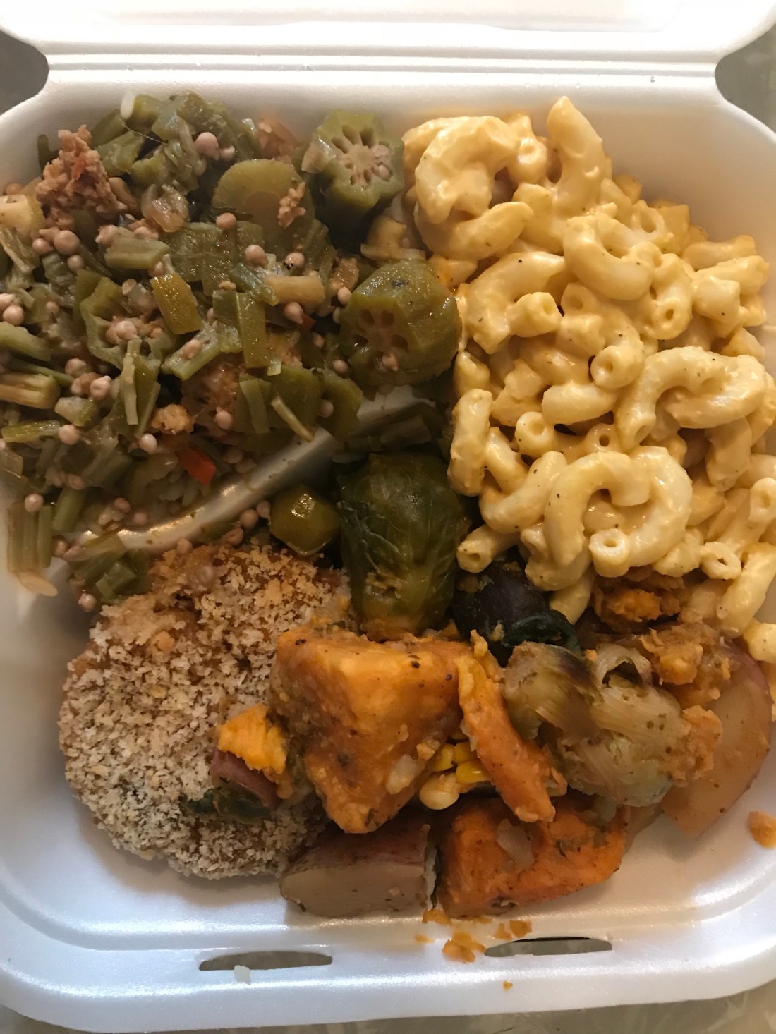 I walked in and man it smelled insanely good. I couldn’t believe it was all plant-based. The owner was there and she was so super sweet. Here you select 4 items that fill a to go box. I couldn’t pick 4, so I got two boxes, filled with every item she had.