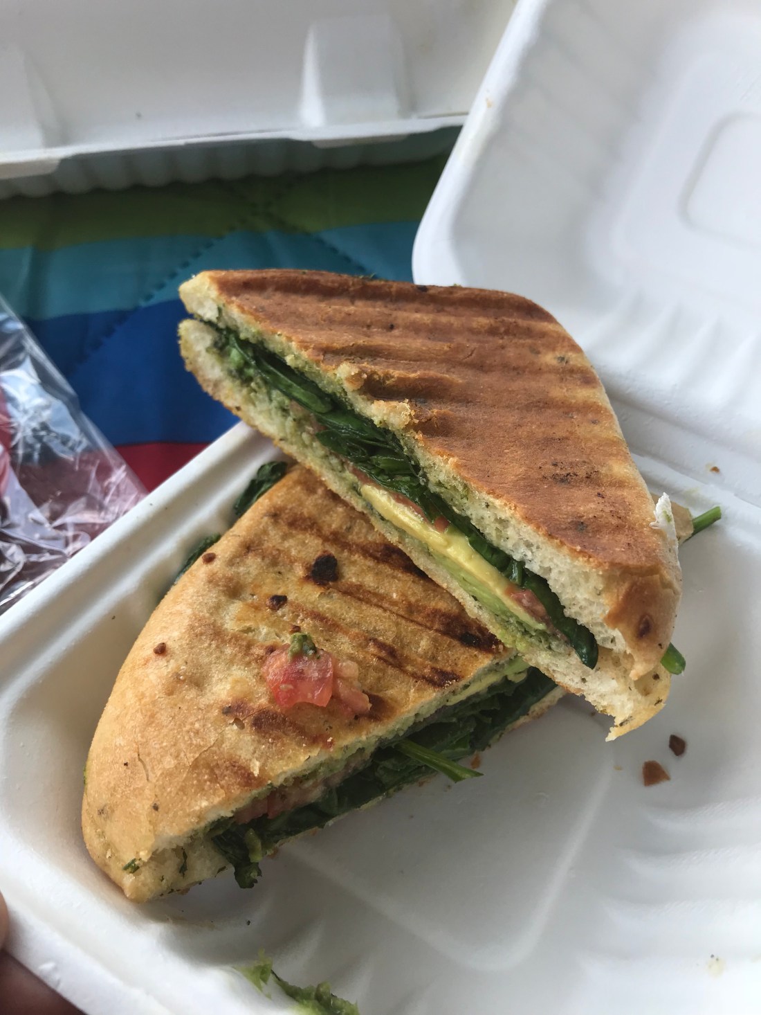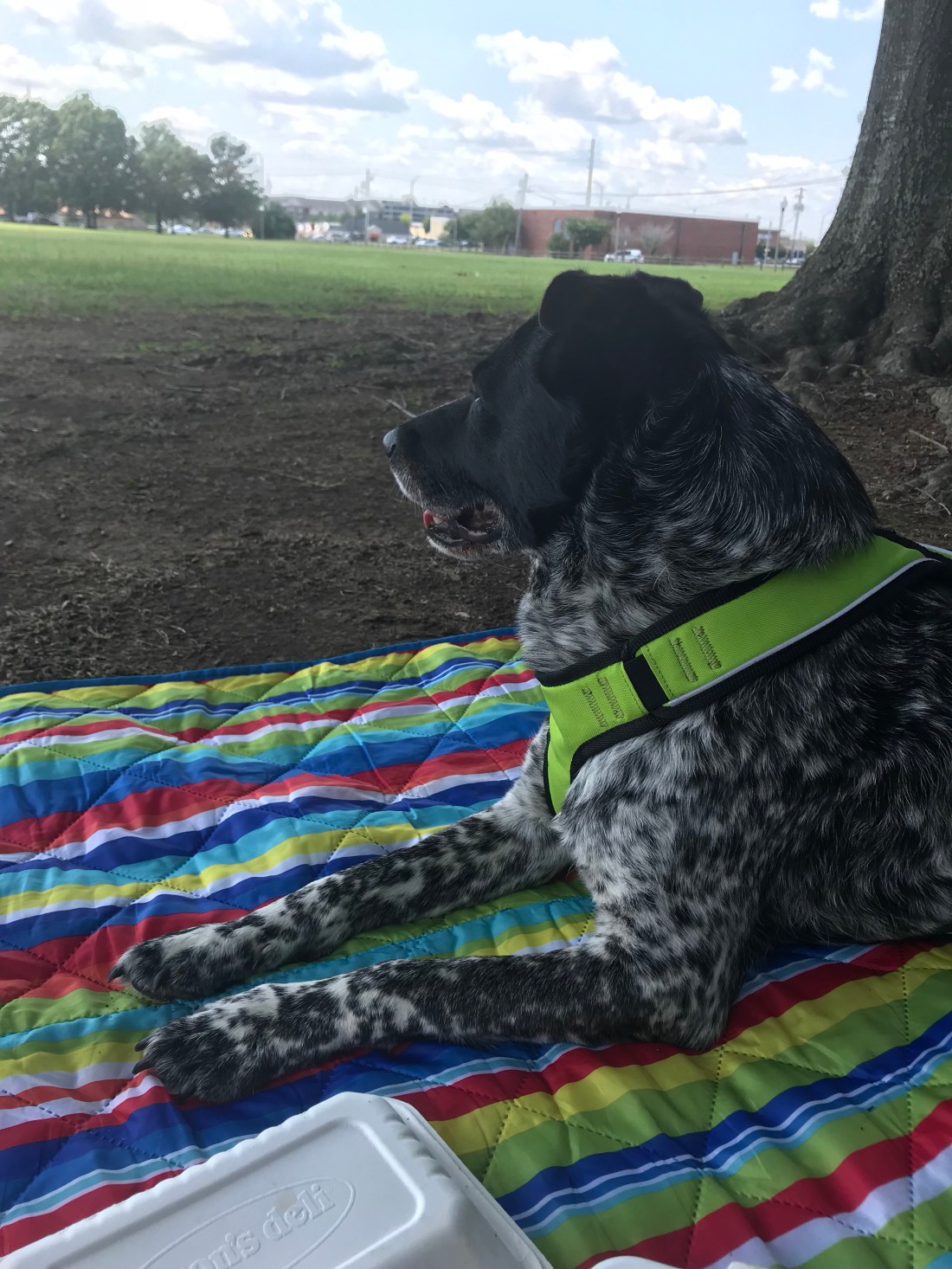 I got a panini that had spinach, avocado, and tomato. Jason got a grilled zucchini sandwich which looked really interesting too. They amazingly had a vegan vegetable soup that was incredible! Loved it! We got wild hibiscus iced tea and that was perfect for this hot day. We sat under a tree and had a picnic. The dogs played and rolled around. This park had a playground structure that was MASSIVE, probably 40-50 feet in the air.