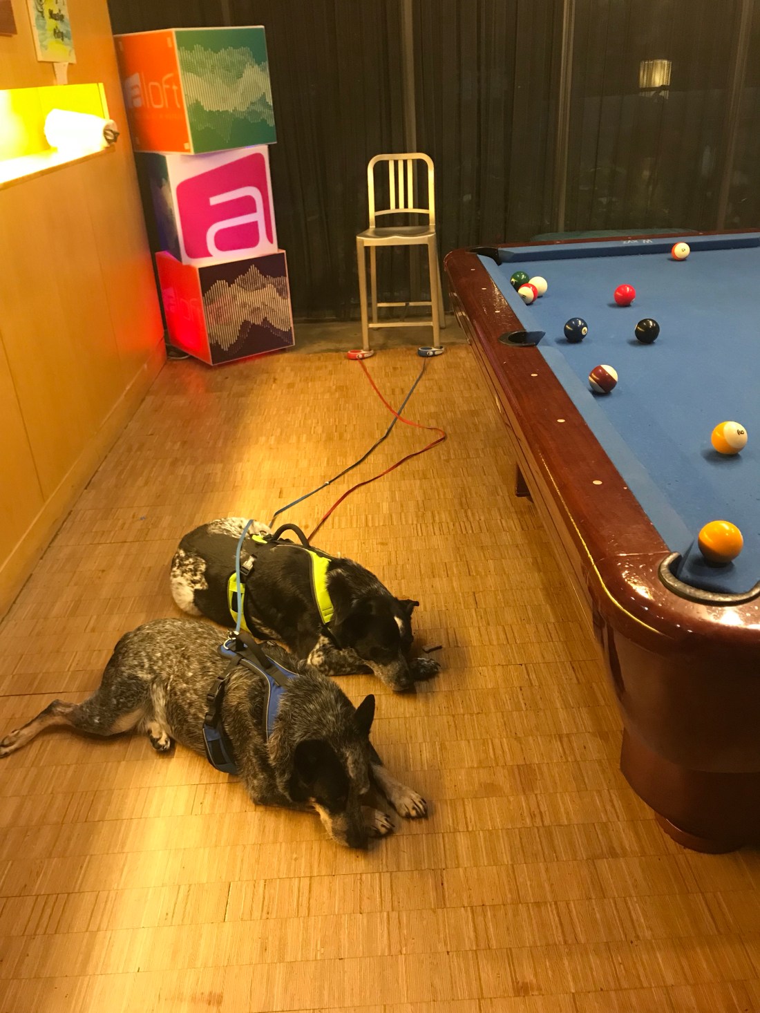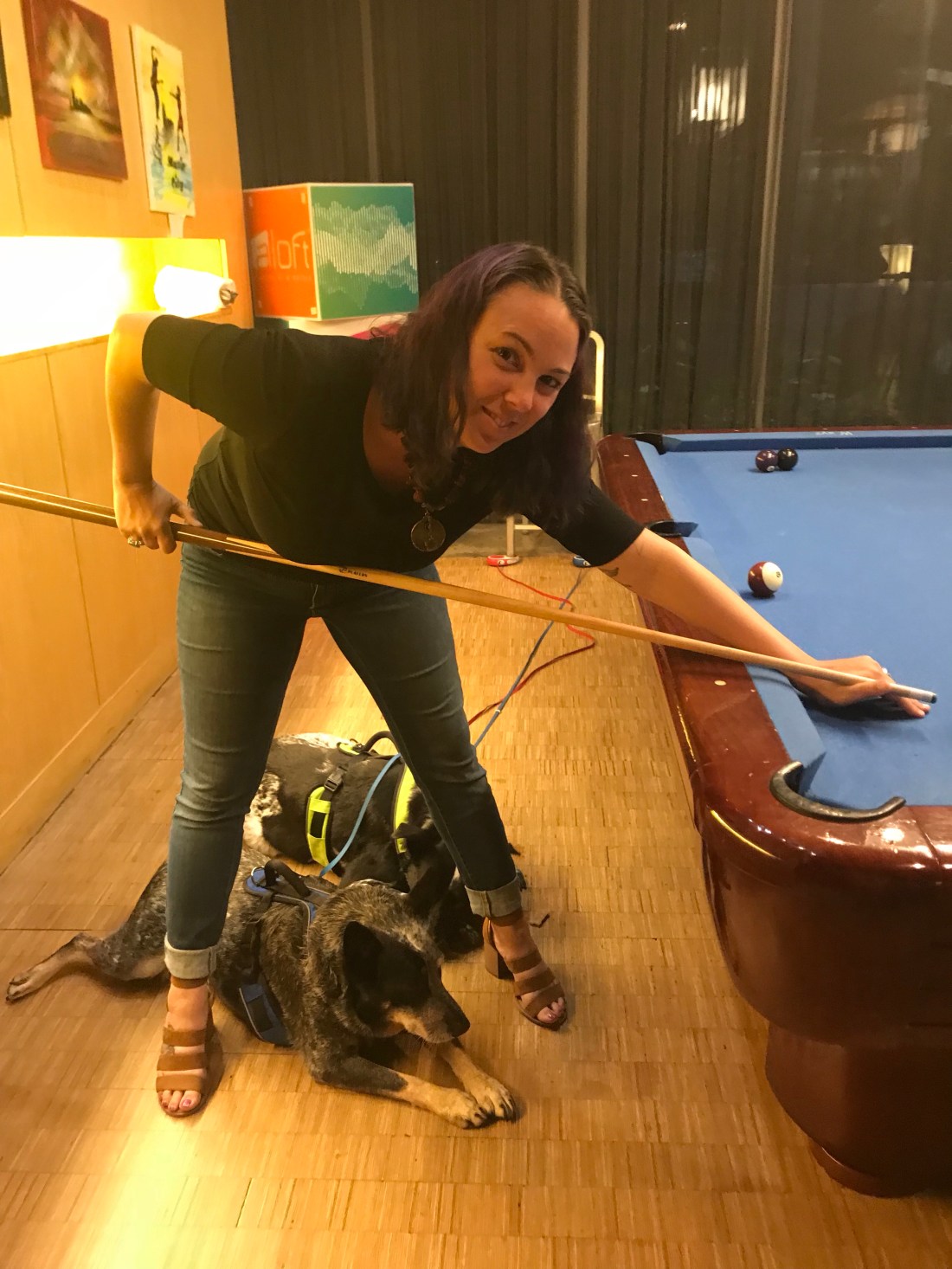 By the time we showered and got ready, we decided to just hang out in the hotel tonight. The pool was open til 11, the hotel had a pool table and a bar with food. And we were basically told there was a concert in Nashville tonight so it was going to be crazy in town. The pups got to stay with us so they were happy too! We grabbed a few drinks and got to playing games at the pool table. The bartender informed us they only had 3 options for food this late at night so I slightly panicked. But low and behold, one was vegan buffalo cauliflower bites! What are the chances! They weren’t fried either so I didn’t feel guilty at all. As you can see the dogs basically stayed under foot the whole time. I made a bet with Jason that I could beat him in overall games won, the loser having to take a shot. Well I lost π. So I took the tequila shot like a champ! We started talking to another couple who wanted to play pool now that we were off the table. She was from Cape Cod! We talked about our road trip and they said they had wanted to buy a camper soon. Of course we totally encouraged them and told them of our whole trip. They invited us to follow them to the next bar they were heading to across the street (which was dog friendly). Jason really wanted to swim first before the pool closed so he went and changed and I brought the pups upstairs to rest for a minute. Well by the time Jason got upstairs after the pool the 3 of us were asleep on the bed so we never did meet up with our new friends.