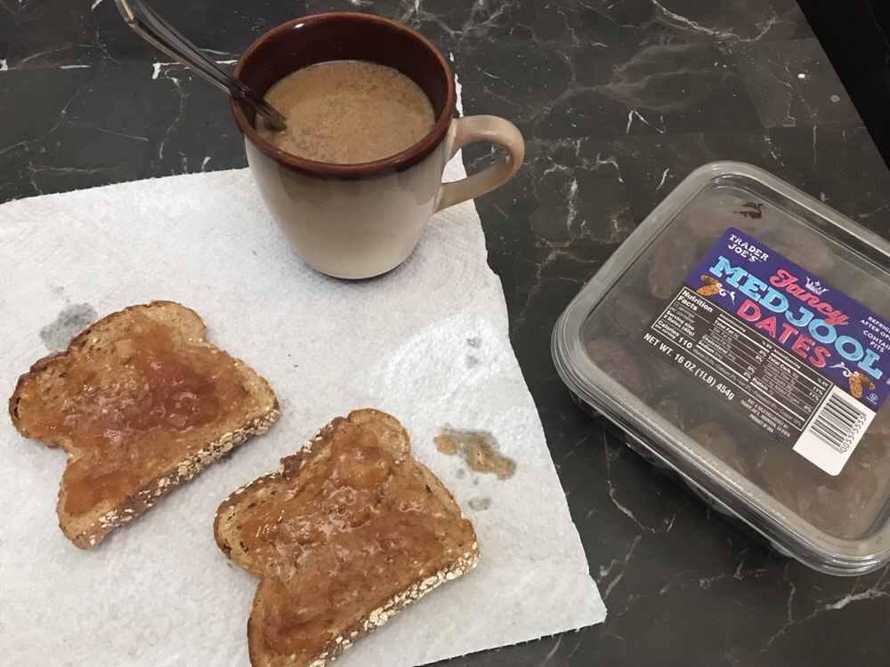 Today’s breakfast was a repeat, but so so tasty. Toast with apple pie jam, coffee with coconut creamer, and dates!