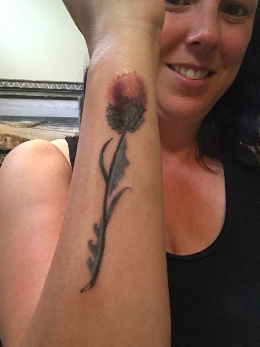 Well what else were we supposed to do? It was raining!! Chris is health inspector and gave us some hints on places that were clean and used vegan ink! I have wanted a thistle tattoo since I first went to Scotland π΄σ §σ ’σ ³σ £σ ΄σ Ώ back in 2007. It symbolizes travel for me. After seeing all of the thistle on our hike the day prior, I knew what we needed to do today. Thankfully Jason was totally ready for the adventure and helped decide on the final design. Notice the mountains and waves on the stem.