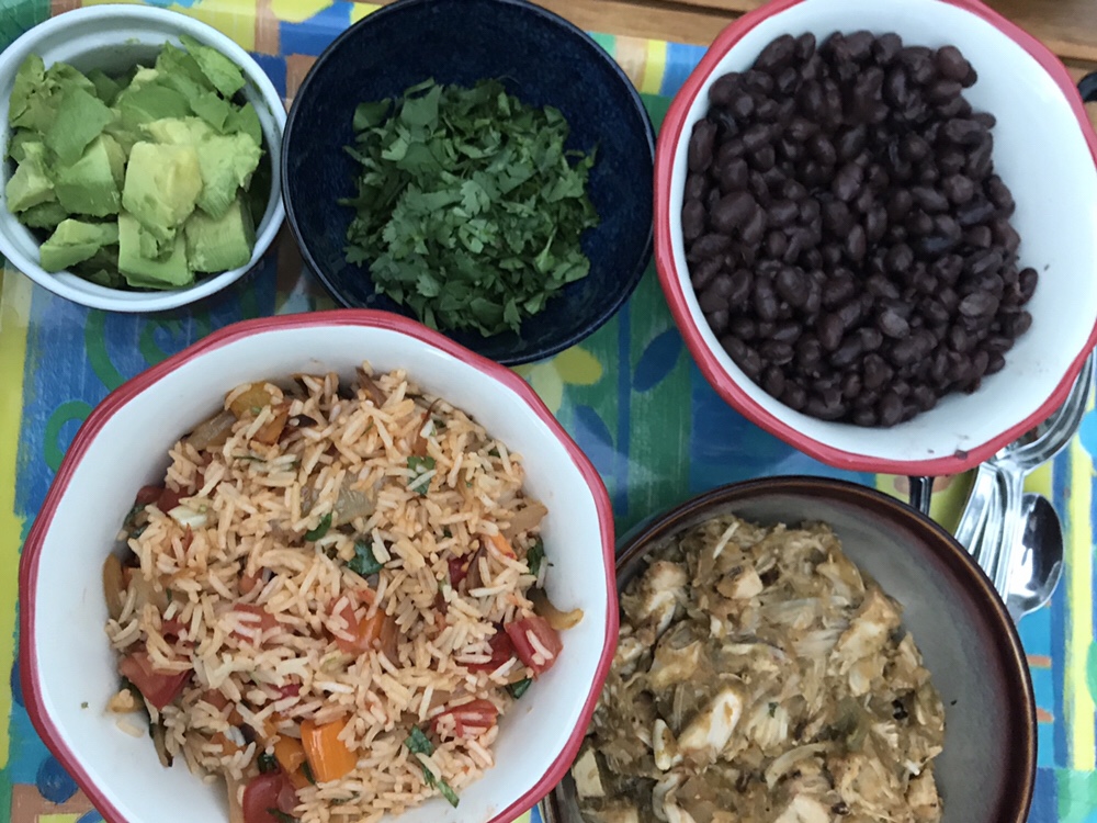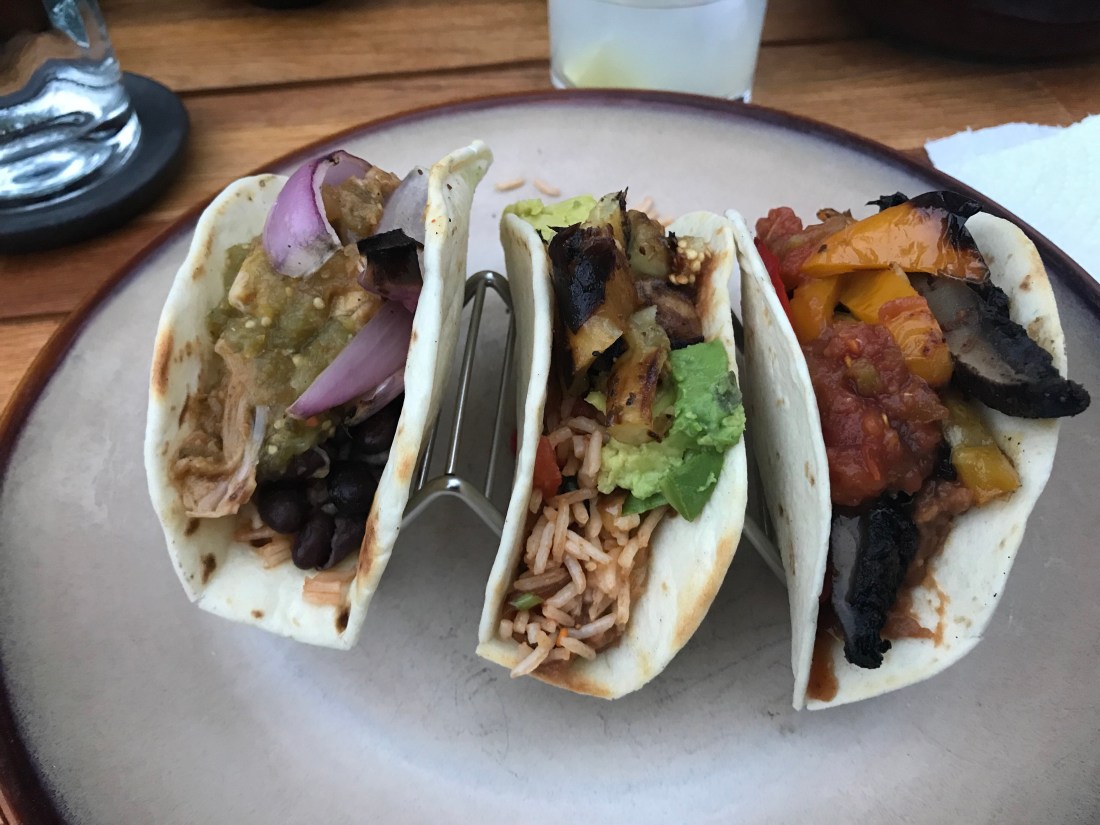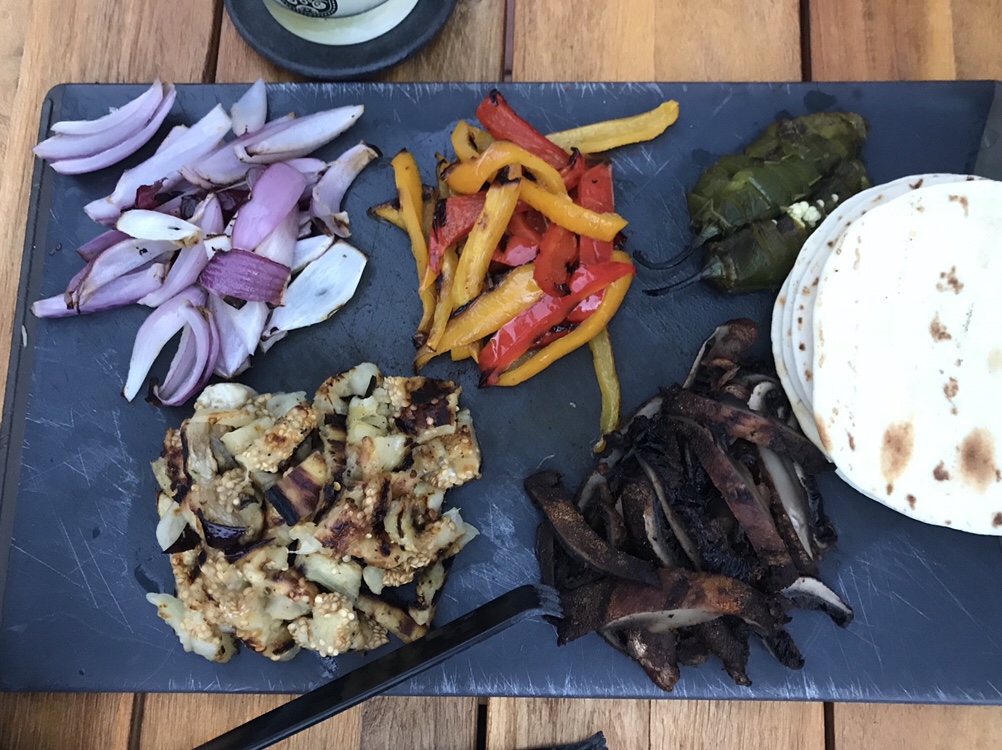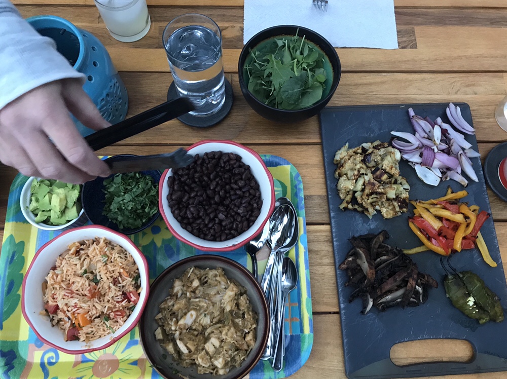 We did green Chile jackfruit, roasted mushroom, eggplant, onions, and peppers, rice, black beans, refried beans (check to ensure they are vegan!), avocado, fresh cilantro, and Daiya pepper jack style shreds. We had so much left over but it was very fun and playful!