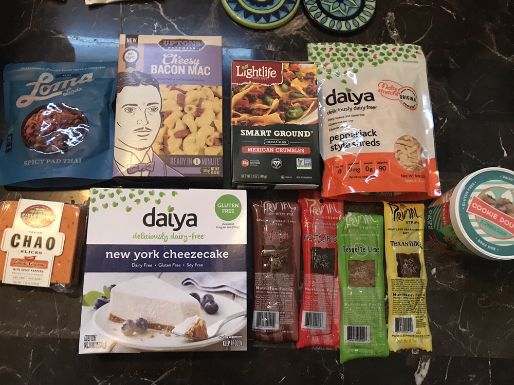 I can home with a HAUL!! Loma spicy pad Thai, cheesy bacon Mac, lightlife Mexican crumbles, Daiya pepper jack style shreds, 4 types of primal jerky (all vegan!), Daiya cheezecake, sliced tomato cheese, and VEGAN COOKIE DOUGH!!!! Whaaaaaat!! More on that later.